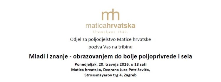 Matica hrvatska vas poziva na tribinu “Mladi i znanje – obrazovanjem do bolje poljoprivrede i sela” u ponedjeljak, 20. travnja 2026. u 18 sati, Matica hrvatska, Dvorana Jure Petričevića, Ulica Matice hrvatske 2, Strossmayerov trg 4, Zagreb.